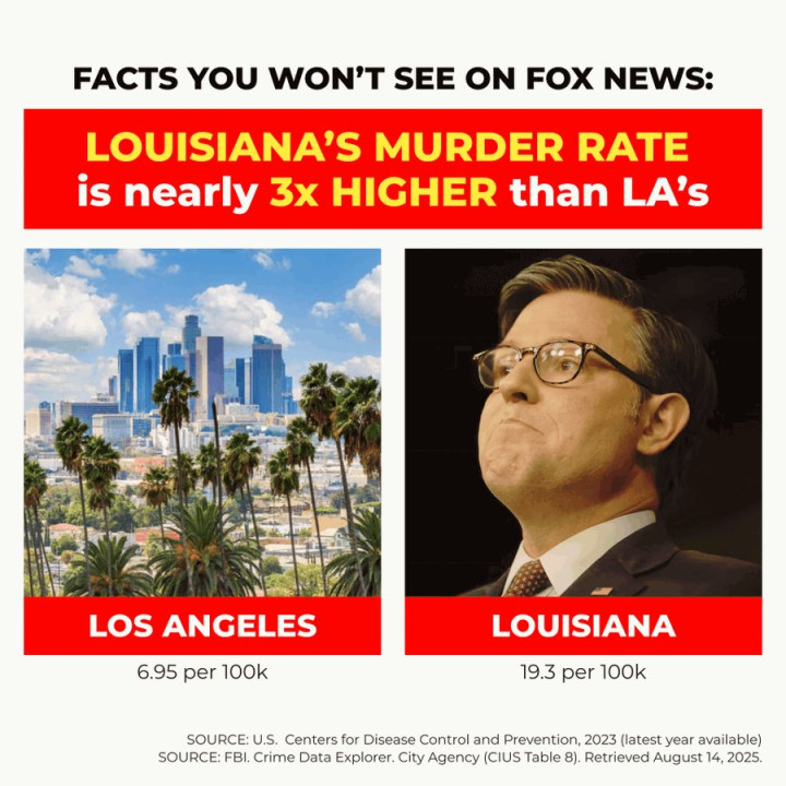 路易斯安那州的谋杀率几乎是洛杉矶的3倍。福克斯新闻,你什么时候报道众议院领导人约翰逊的失败?