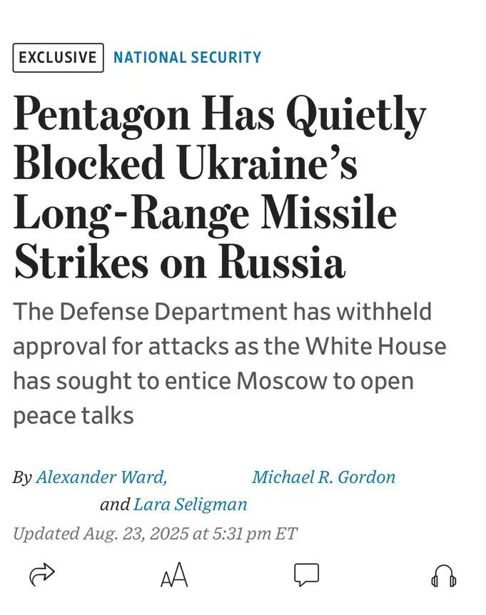 五角大楼悄悄禁止乌克兰使用美国导弹对俄罗斯进行远程打击,据《华尔街日报》8月23日报道,美国已悄然启动审查程序,授权国防部长皮特·赫格塞斯禁止乌克兰使用美国导弹对俄罗斯境内进行远程打击,此举有效阻止了乌克兰数月来的打击。@WSJ报告2025年8月24日 上午1:28