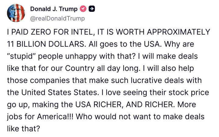 美国总统唐纳德·J·特朗普试图为上周与英特尔达成的协议辩护。根据该协议,美国政府获得了这家跨国科技公司10%的股权。此后,这项协议遭到保守派和自由派的强烈反对,他们称其类似于社会主义/共产主义,特朗普甚至称那些反对该决定的人“愚蠢”。