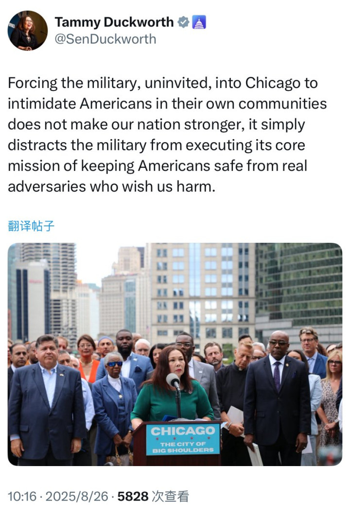 塔米·达科沃斯:强迫军队未经邀请进入芝加哥恐吓社区中的美国人,这并不能使我们的国家更加强大,而只会分散军队执行其核心使命的注意力,即保护美国人免受那些想要伤害我们的真正对手的伤害。