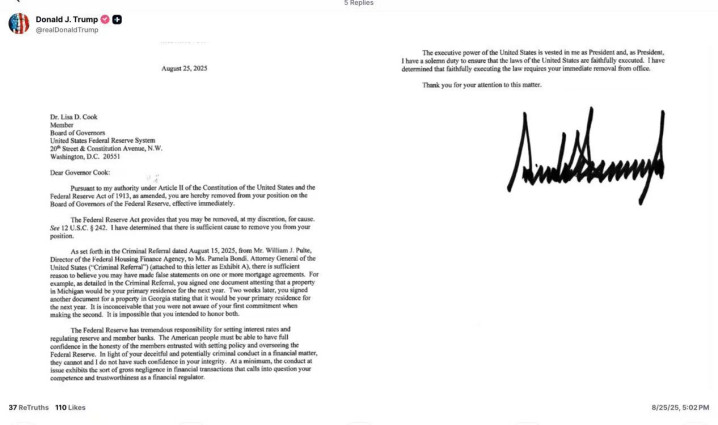 唐纳德·特朗普总统宣布罢免美联储理事丽莎·库克,其根据《美国法典》第 12 卷第 242 条的权力。这一决定是史无前例的,而且几乎肯定会在法庭上受到质疑,因为美联储的独立性长期以来一直被视为宪法规范。中央银行政治化可能会损害其信誉、降低通胀预期、并推高美国 35 万亿美元国债的偿还成本。