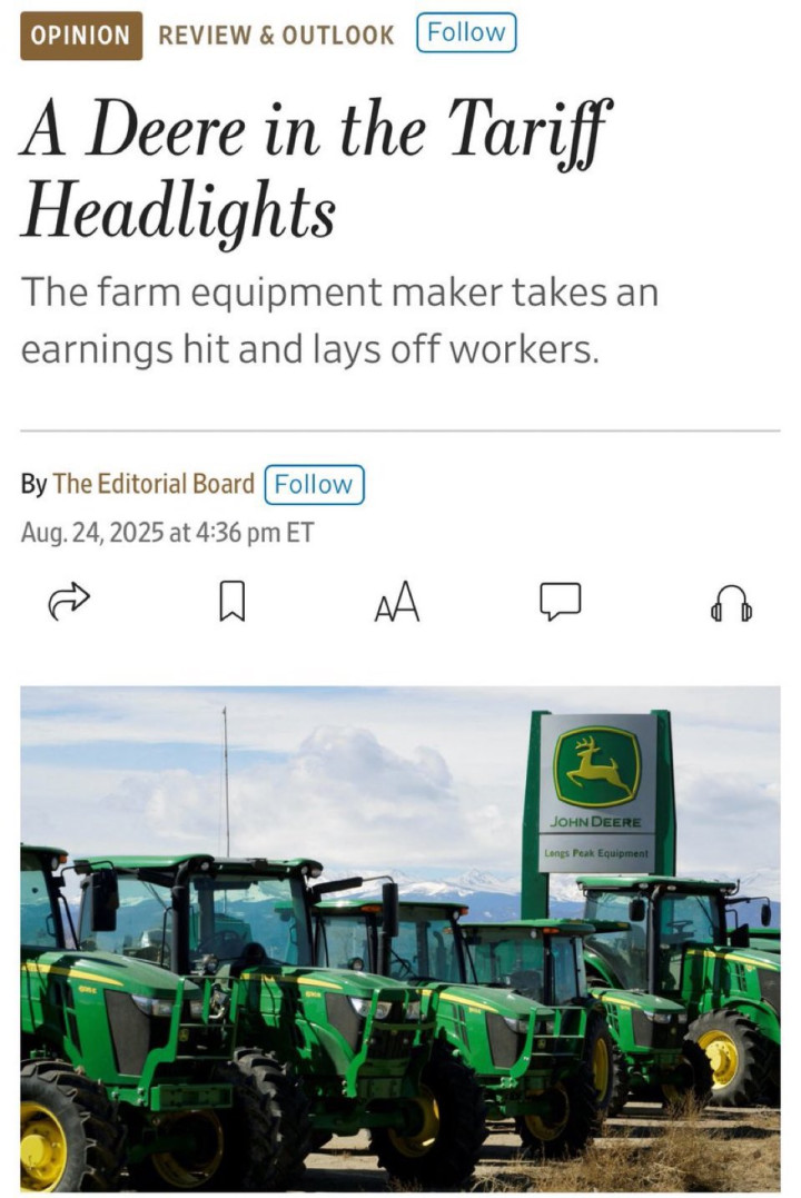 彭斯:约翰迪尔公司宣布:由于关税和大宗商品价格下跌,将在爱荷华州三家工厂裁员238人投资者关系总监乔希·比尔 (Josh Beal) 表示:本季度关税成本约为 2 亿美元,这意味着今年迄今为止我们的关税支出约为 3 亿美元。美国企业和消费者正在为关税买单。是时候回归与自由国家的自由贸易了